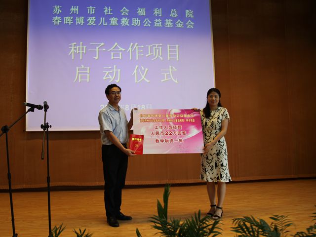 8月18日,苏州市社会福利总院与春晖博爱儿童救助基金会种子合作项目启动仪式在总院哆啦剧场举行。总院院长孙惠忠及特邀嘉宾南京儿童福利院院长朱洪参与启动仪式并发表了热情洋溢的讲话。苏州市民政局副局长陈燕顔与基金会运营总监刑戎共同为项目揭牌。