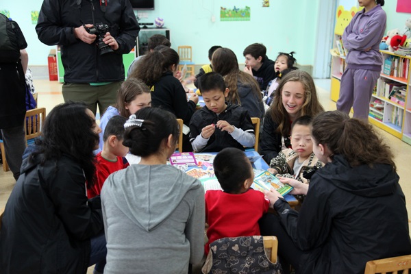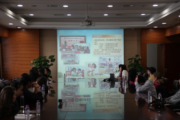 访问团一行听取了我院历史、发展及工作现状的介绍,双方就各自关心的儿童福利有关话题展开交流。随后,访问团一行参观了儿福中心和社会体验园。在儿福中心,美国学生们与孩子们进行了互动交流,为孩子们讲故事,表演节目,赠送图书、糖果等礼品,现场气氛热烈。社会体验园集蔬菜种植、动物饲养、手工作坊于一体,让机构儿童、老人全方位体验社会生活,让访问团的师生们赞叹不已。