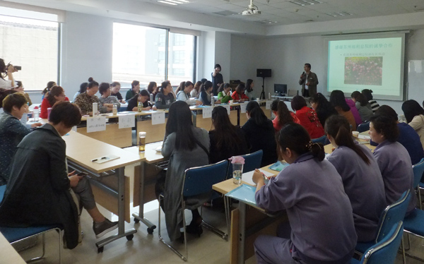 我院孙惠忠院长作开班致辞,介绍了我院合作项目的概况。与会学员实地参观了儿童福利中心,对我院项目开展半年来取得的成效赞口不绝。培训会2天的课程紧张而丰富,基金会的老师讲解了“如何将康复融入日常活动”、“特需儿童咀嚼训练、如厕训练”等贴近实际工作的知识,并带领大家练习如何将所学内容转化去再培训家园的父母们。