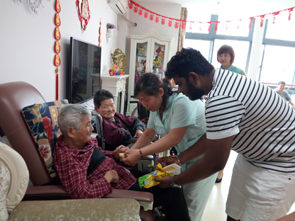 志愿者们给老人分发了水果与饼干,为助兴男留学生还为老人现场演绎了一首中文歌曲《月亮代表我的心》,得到了现场老人热情的肯定。在工作人员的建议下,现场老人及家属、其他志愿者、工作人员给这个远道而来的寿星唱起了《祝你生日快乐》,这让寿星激动不已。简单的语言让老年人感受到了来自异国他乡的祝福,而中国奶奶赠予印度留学生的一朵康乃馨也表达了对于他们的感谢之情。