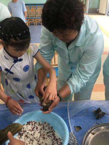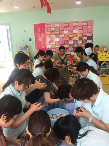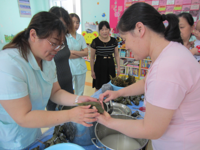 由于家园的爸爸妈妈们都来自不同的地方,有很多都不会包粽子。我们这些第一次包粽子的生手们在老师傅的带领下一个个学得有模有样。还有一位陕西阿姨用电视上学到的新式包粽子方法包了一回粽子,让我们大开了眼界。一个个姿态各异的粽子就在我们的巧手中成型了,虽然形状不见得很规整,但是重在我们包粽子的过程,大家一起欢声笑语、嘻嘻哈哈团圆过节,体会到了团队活动其乐融融的氛围,也不断加深了大家之间的交流和感情。