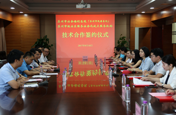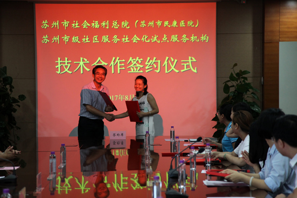 8月10日上午,苏州市社会福利总院(苏州市民康医院)与12家苏州市级社区服务社会化试点服务机构技术合作签约仪式在我院举行。市民政局副局长胡跃忠、社会福利与慈善事业处副处长高云出席签约仪式,我院孙惠忠院长、许丽芳副院长、精福中心专家团队和苏州工业园区行知社工发展中心、太仓市瑞恩社会工作发展研究中心、苏州市清流社工服务中心等12家市级社区服务社会化试点服务机构负责人参加签约仪式。仪式由市民政局社会建设工作处副处长戴参主持。