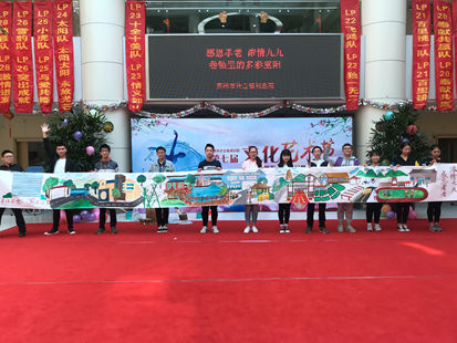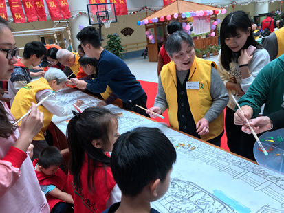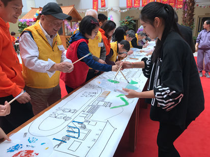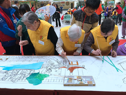 10月28日重阳节上午,为了增添节日气氛,老福中心在共享空间开展“卷轴里的多彩重阳”特别活动。社工提前拟定好作品内容,以“浓情久久,感恩孝老”为主题,以“家在总院”为绘画素材,由来自苏州幼儿师范学校的12位志愿者带着老人,现场调色,共同为画卷上色,为院里老人的生活增添色彩。在创作过程中,老人们或是专心致志,或是笑逐颜开,最终在志愿者的协助下,完成了这幅十米巨作。