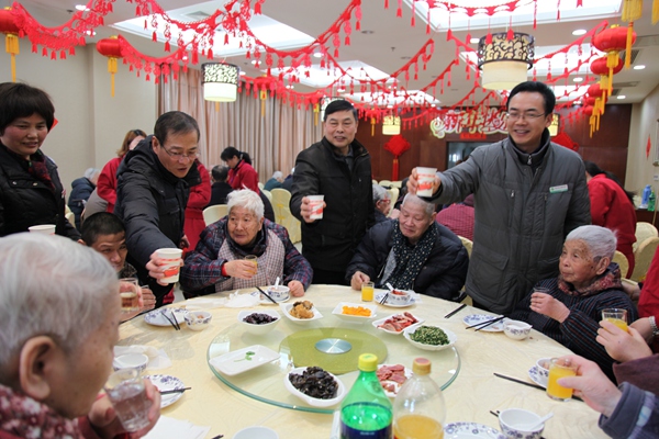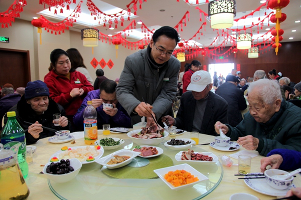 餐厅内张灯结彩,服务对象齐聚一堂,欢声笑语,品尝着食堂精心准备的年夜饭。孙惠忠院长首先代表全院干部职工向服务对象致以节日问候和新春的祝福。随后,院领导和职能科室、四大中心负责人来到服务对象身边,悉心询问服务对象对我院各项工作的意见建议。