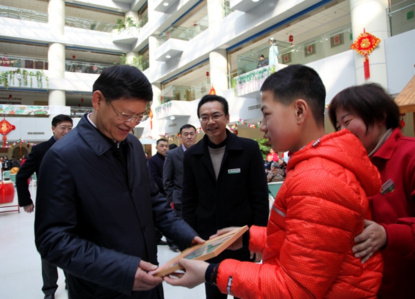 李亚平市长一行先后走访了总院医疗行政综合楼、老年福利中心等,详细了解了总院运营情况、服务保障情况和节日排班情况。在老年福利中心,李市长与工作人员一一握手,并代表市委、市政府向总院干部职工致以节日问候和新春祝福。在老福中心共享空间,李市长与院内孤残儿童亲切互动,关心他们的生活、学习情况,随后孤残儿童小苏将自己亲手绘制的寓意“幸福美满”的蜡笔画送给李市长。李市长对总院工作表示充分肯定,对节日期间坚守岗位的一线工作人员表示感谢,并提前祝工作人员和服务对象新春快乐。