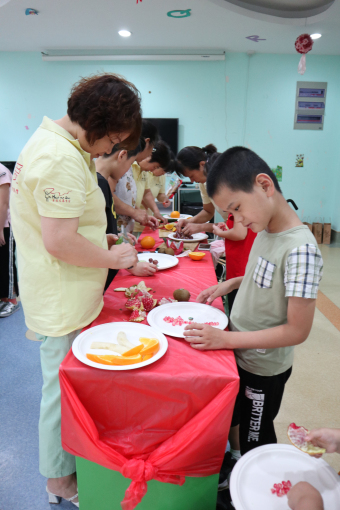 9月20日,为庆祝传统中秋佳节的到来,儿福中心组织了一次亲子互动活动,妈妈和孩子一起用水果做出美丽的水果拼盘。