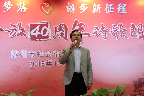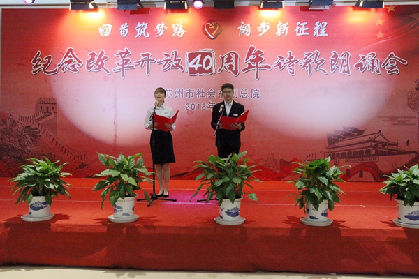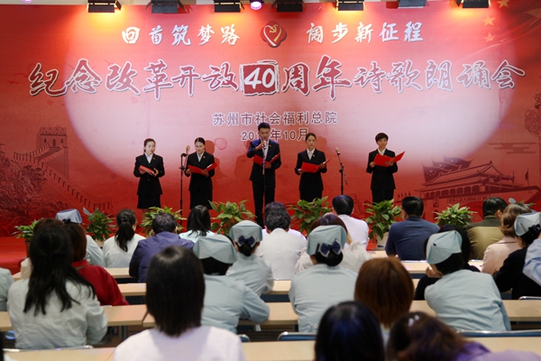 来自各中心、科室10组代表队参加比赛,参赛诗歌作品紧扣主题,围绕苏州和福利总院的人文底蕴、历史文化和改革开放后的发展新貌等进行朗诵,讴歌改革开放40年来苏州取得的伟大成就,展现福利总院里的幸福生活,展望新时代中国特色社会主义的美好未来。朗诵会的最后总院孙惠忠院长作总结讲话,孙院长从福利总院的飞速发展、院内服务对象的美好生活和全院职工的精神面貌三个方面总结了改革开放后总院的巨大变化,他希望全院干部职工继续“不忘初心,牢记使命”,努力为总院各项事业的发展作出新的贡献。