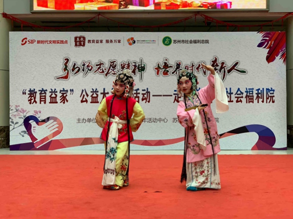 4月26日下午2点,园区青少年活动中心“教育益家公益大篷车”系列活动走进苏州市社会福利总院,为院内的老人、孩子和残疾人献上了一台精彩的劳动节文艺演出。活动现场欢声笑语,好不热闹。演出开始前,总院陈永珍副院长上台致辞,祝愿在场的所有大朋友、小朋友和爷爷奶奶们节日快乐,并向演出单位苏州工业园区青少年活动中心表示感谢。