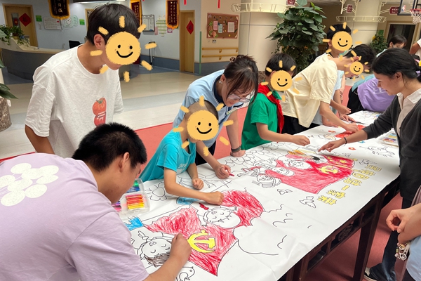 下午的主题活动中,创意与温情在指尖流淌。院内儿童与残疾青年携手,在10米长的画布上挥洒色彩。用稚嫩的笔触描绘天安门和五星红旗。老福中心共享空间内,20位老人正专注地编织竹编画,制作出“五星红旗”“爱我中华”等作品。 活动尾声,白发苍苍的老人与孩童十指相扣,温馨的“共切蛋糕”环节将气氛推向高潮,工作人员为服务对象递上蛋糕,大家围坐一起,分享甜蜜与祝福。