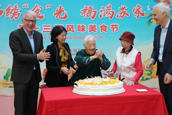 活动现场气氛热烈而温馨,来自德国法兰克福老年人和残疾人护理协会代表团的国际友人也莅临现场,与院内两位百岁老人代表共同切开了象征健康长寿的甜蜜蛋糕,向大家传递了重阳节的美好祝福。美食节现场,大家不仅被各式各样的美食所吸引,还体验了苏州的传统文化。在美食展区重阳糕成为了热门美食,老人们对苏式糕点赞不绝口,纷纷表示这是地道的苏州味道。活动现场还设置了桃花坞木版年画体验区,大家在非遗大师的指导下,亲手体验了这一古老艺术的魅力。具有苏州特色的木版年画“一团和气”在大家手中逐渐成形,纷纷用相机记录下这难忘的时刻。